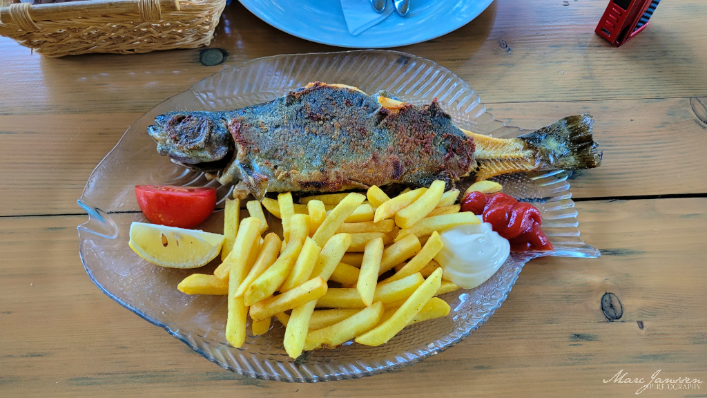 Direkt neben dem See gab es ein Restaurant, und das Beste daran: Man konnte seinen frisch gefangenen Fisch dort abgeben und zubereiten lassen. Kurze Zeit später saßen wir gemeinsam am Tisch und bekamen unseren eigenen Fang, frisch zubereitet, mit Beilage serviert. Für die komplette Zubereitung inklusive Beilage zahlten wir nur 10 Euro. Frischer geht es kaum – vom See direkt auf den Teller.